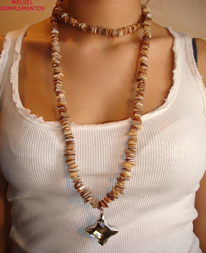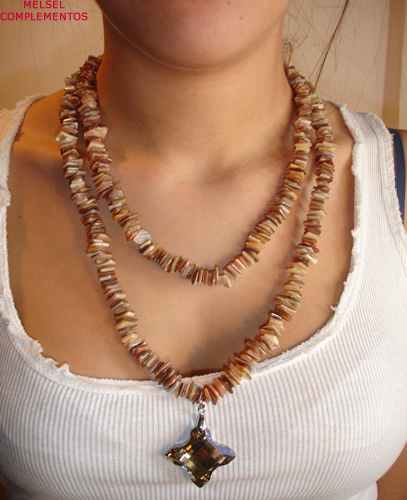 Collar de chips de nácar de color crudo y colgante de cristal facetado con forma de rombo. Este collar se puede colocar de tres formas: 1. Con el nudo hecho 2. Con doble vuelta corto 3. Con doble vuelta largo |