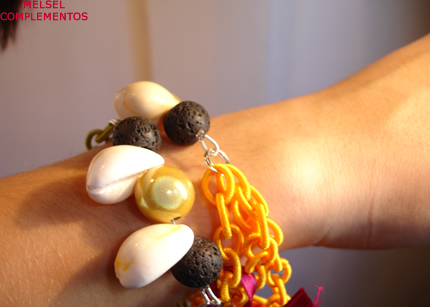 Pulsera de cadena de seda, caracolas, piedra volcánica negra y bola fantasía.