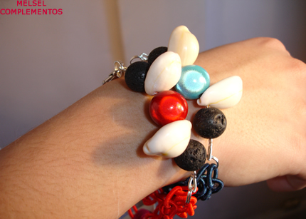 Pulsera de cadena de seda, caracolas, piedra volcánica negra y bola fantasía.