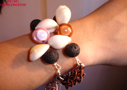 Pulsera de cadena de seda, caracolas, piedra volcánica negra y bola fantasía.